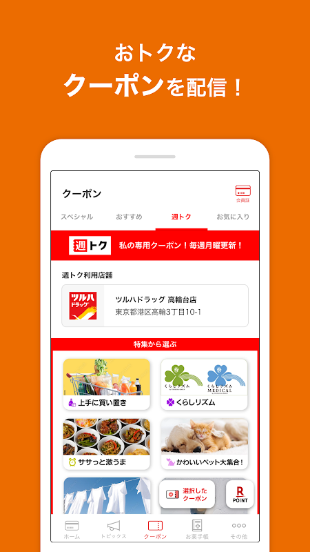 Anda dapat menampilkan kartu poin, melakukan pembayaran ponsel cerdas, memperoleh kupon, memeriksa penawaran menarik seperti informasi acara dan informasi kampanye, pencarian toko, dan menautkan ke aplikasi buku catatan pengobatan.