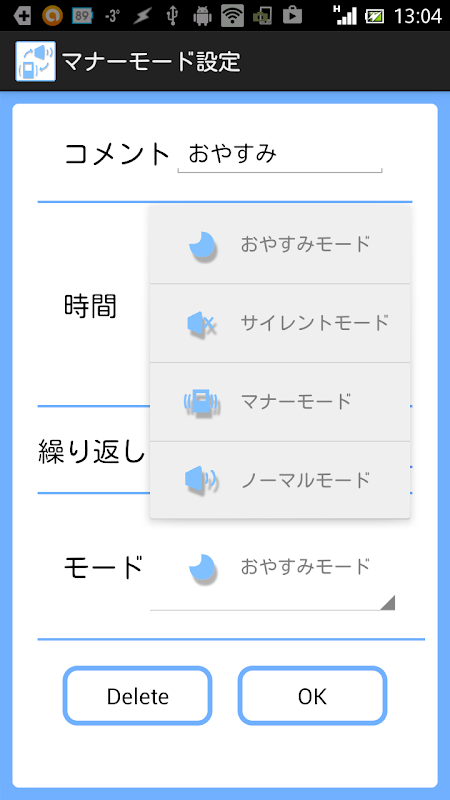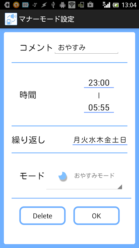 このアプリは、あらかじめ設定した時間に、マナーモードに自動的に切り替えてくれるアプリです。