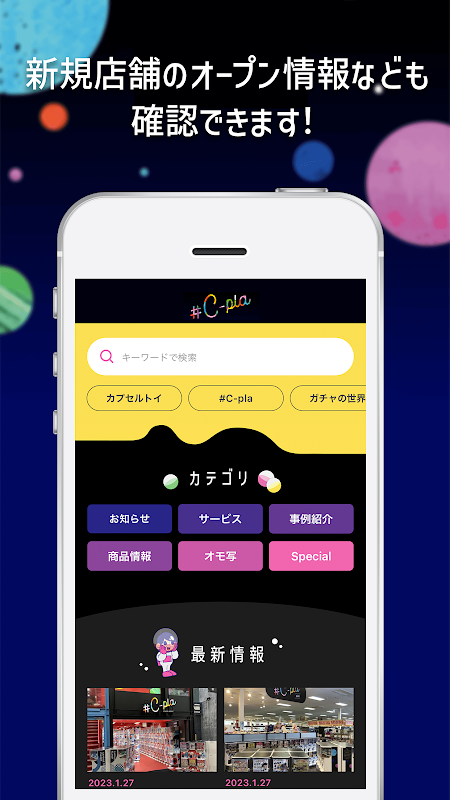 Aplikasi resmi #C-pla, toko khusus mainan kapsul yang beroperasi secara nasional, kini tersedia! Selain informasi terbaru dari #C-pla, Anda dapat dengan mudah mencari toko secara nasional.