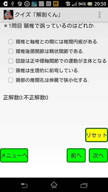 解剖学に関する動画の部位名や筋肉名の四択問題。英語名での問題も可。また解剖学に関する国家試験問題を解くこともできる