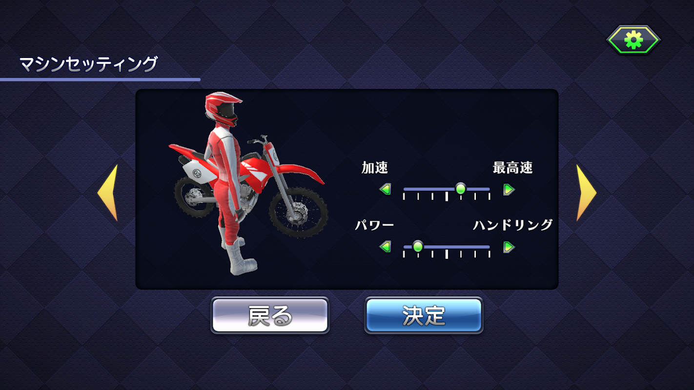 バイクのカスタマイズによって操作感は異なりますので、コースや自分に合ったスタイルを探してみてください。