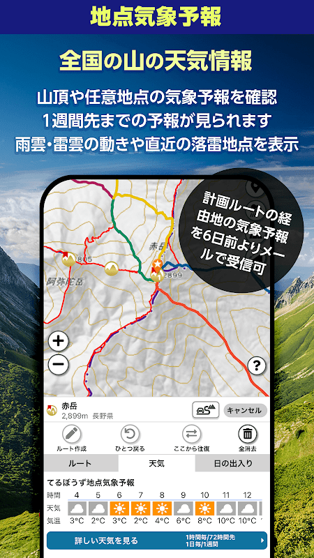 ・Sebagai fitur yang direkomendasikan untuk pemula, saat Anda mengetuk ikon puncak gunung yang akan didaki, rute yang direkomendasikan untuk rute berangkat dan kembali akan ditampilkan, sehingga Anda dapat memilih rute dan membuat rencana.