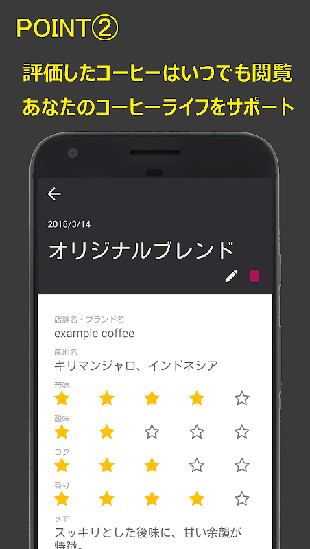カフェで飲んだコーヒーや自宅で淹れたコーヒーの名前、産地、味などを手軽に記入して、いつでも見ることができます。また、味の評価は苦味、酸味、コク、香りのそれぞれ4つを5段階で決めることができるので、コーヒーの味を忘れることもありません。