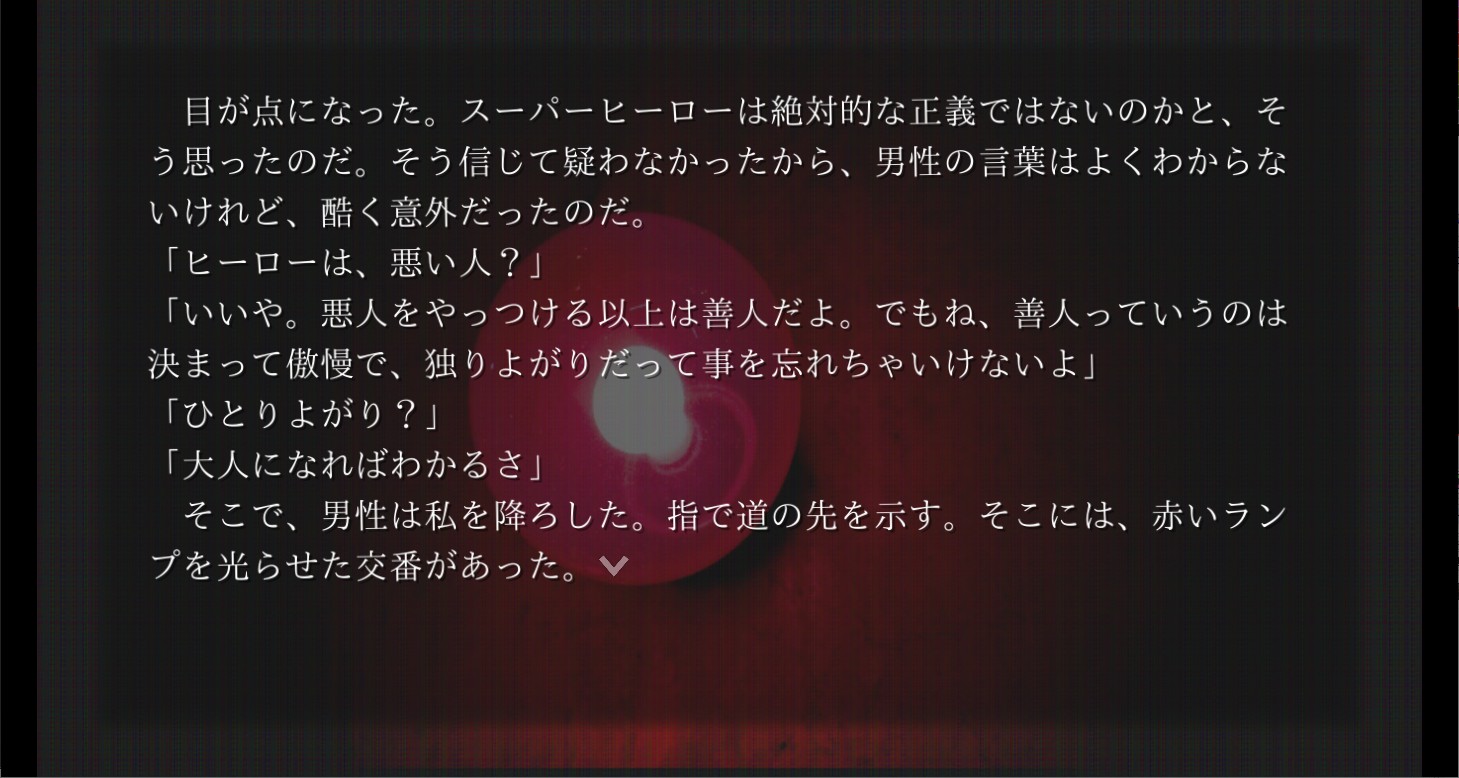 「EightStories」で再構築されたプログラムを更に改修し、画面演出を強化。キャラクター画像などはありませんが、より「読み物」としてのデジタルノベルの楽しさを目指しました。