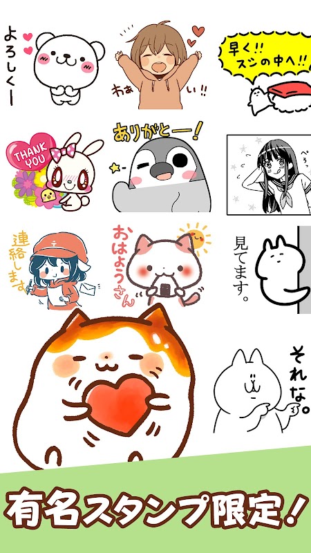 Aplikasi ini secara resmi disetujui oleh seniman perangko terkenal. Anda dapat mengirim prangko ke obrolan Anda langsung dari aplikasi. Ini gratis. (Dapat digunakan segera setelah instalasi. *Tidak perlu registrasi)