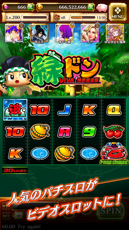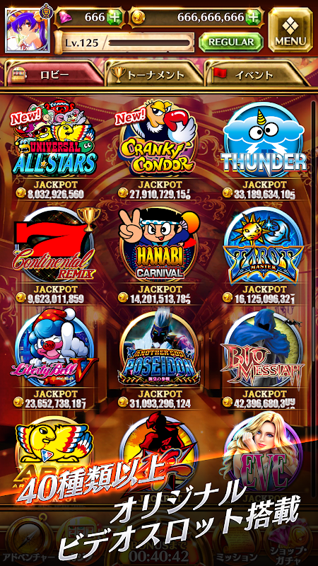 Anda dapat dengan bebas memainkan slot yang dirilis dalam mode petualangan. Dilengkapi dengan fungsi "Turnamen" untuk bersaing dengan pemain lain dan "Jackpot" jackpot super!