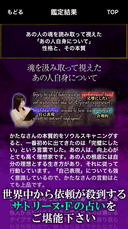 本アプリは、世界中から依頼が殺到するソウルスキャナー「サトリーヌ.F」の鑑定をあなたのお手元でご体験できるアプリです。魂を解読し、そのすべてを視抜いていきます。