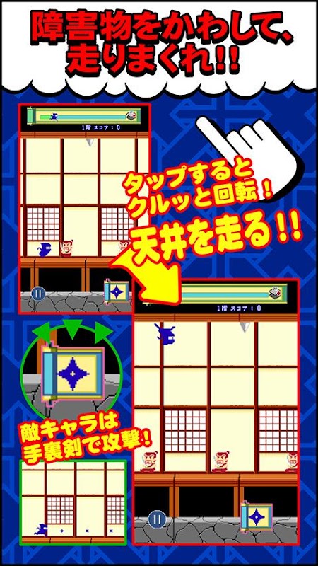 操作は超簡単!横スクロールして進んでいく忍者を画面タップで床、天井と反転させながら障害物を避け、
