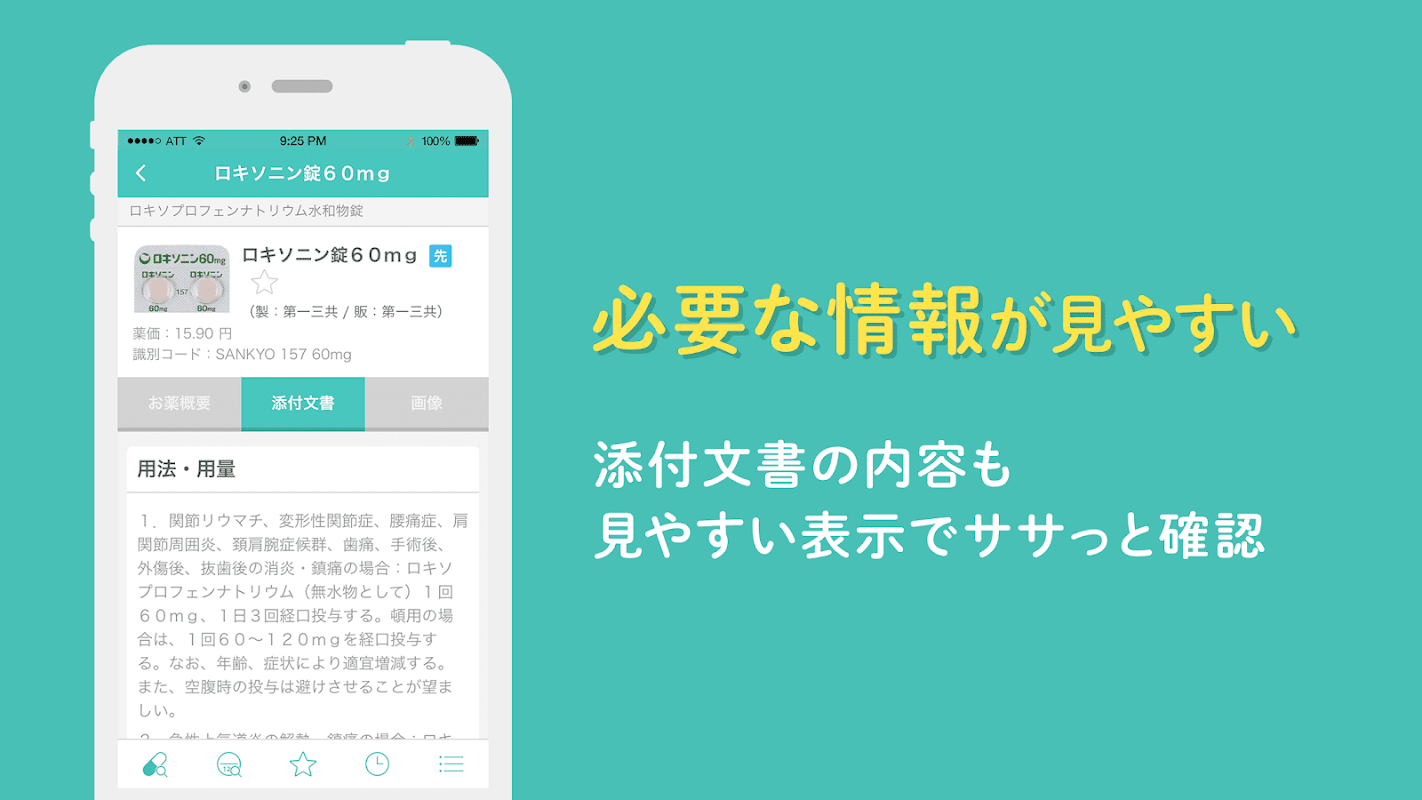 添付文書の情報から必要な情報だけをわかりやすく抽出しており、添付文書や剤形画像も見ることができます。