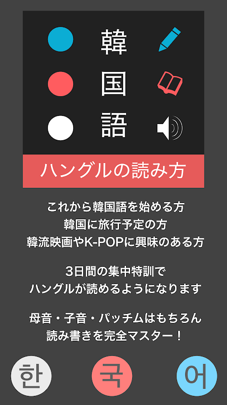 このアプリでは3日間の集中学習を通じて、ハングルの読み方と書き方を徹底的に訓練します。