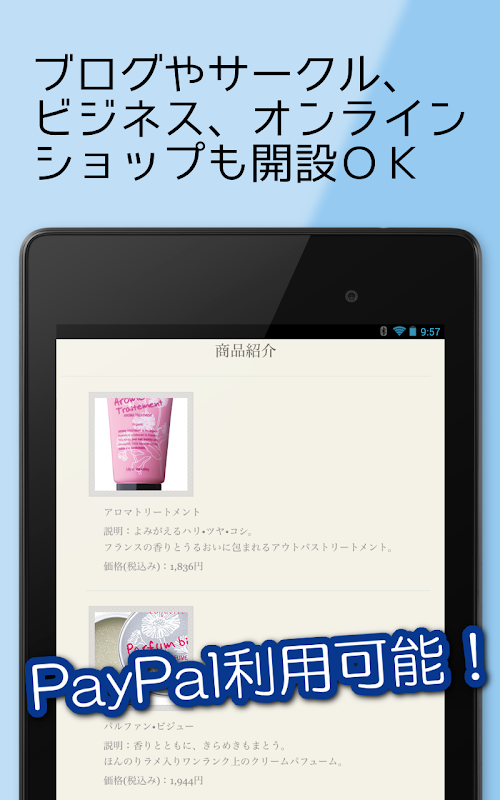 商品決済機能(PayPal)を付けることができ、ネットショップを作成できます。