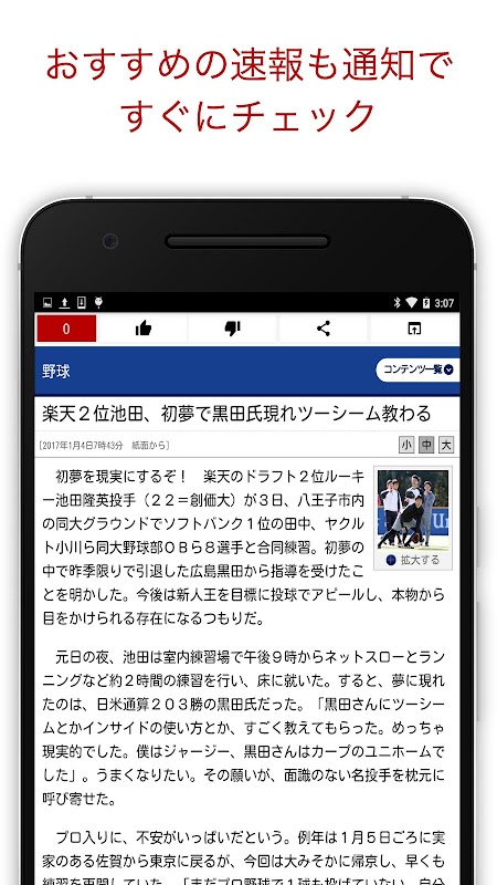 プロ野球の試合時間30分前に通知を受け取ることや、朝昼晩ニュース通知もできます。