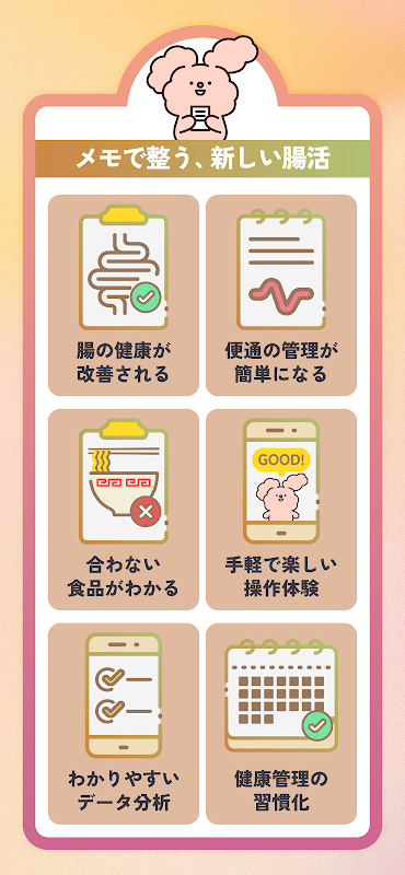 Berdasarkan hasil penelitian ini, ``Aktivitas Usus Raku Memo'' menekankan desain yang memungkinkan Anda melacak makanan dengan mudah, yang penting untuk meningkatkan kesehatan Anda.