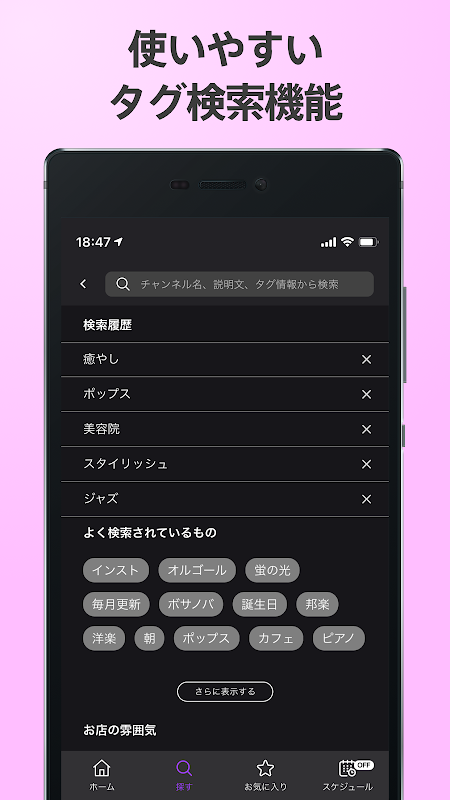 Anda dapat mencari saluran berdasarkan genre musik, industri toko, dan suasana hati.