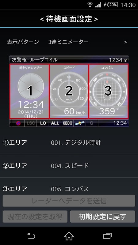 本アプリでレーダー本体の待機画面の表示パターンおよび表示項目の設定を変更することができます。またアプリ内に初期設定を保存しているので、設定のみを初期設定に戻すことができます。