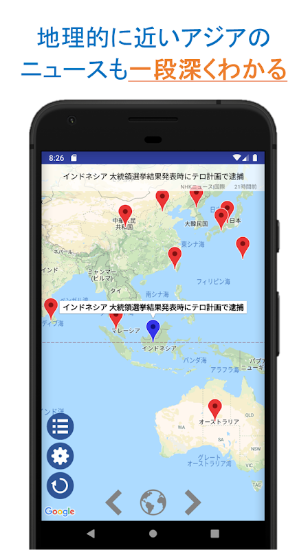 Ini adalah aplikasi berita yang memetakan dan menampilkan berita internasional di peta dunia. Karena Anda secara intuitif dapat memahami berita internasional, Anda secara alami dapat memperoleh rasa geografi dan mendapatkan pemahaman yang lebih dalam tentang urusan internasional.
