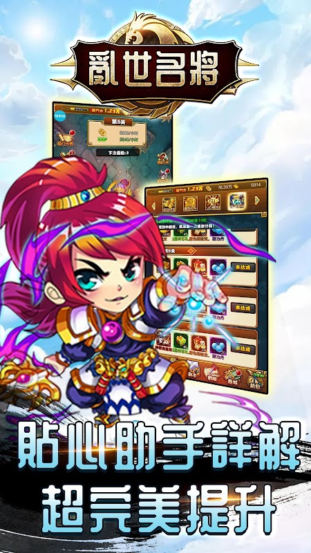 《亂世名將》是一款全新的策略回合卡牌對戰遊戲。經典畫風武將、專屬戰鬥動作、傲嬌對話獨白、演繹Q萌新境界。碎屏級怒氣必殺特效,騰空、連擊、爆發,讓你的戰鬥體驗一氣呵成!以豐富多變的戰鬥體驗、知名畫師製作的超精美卡牌、大師級的畫面表現以及極富策略性的玩法帶領玩家重回烽火連天的三國,呈現前所未有的全新三國體驗!