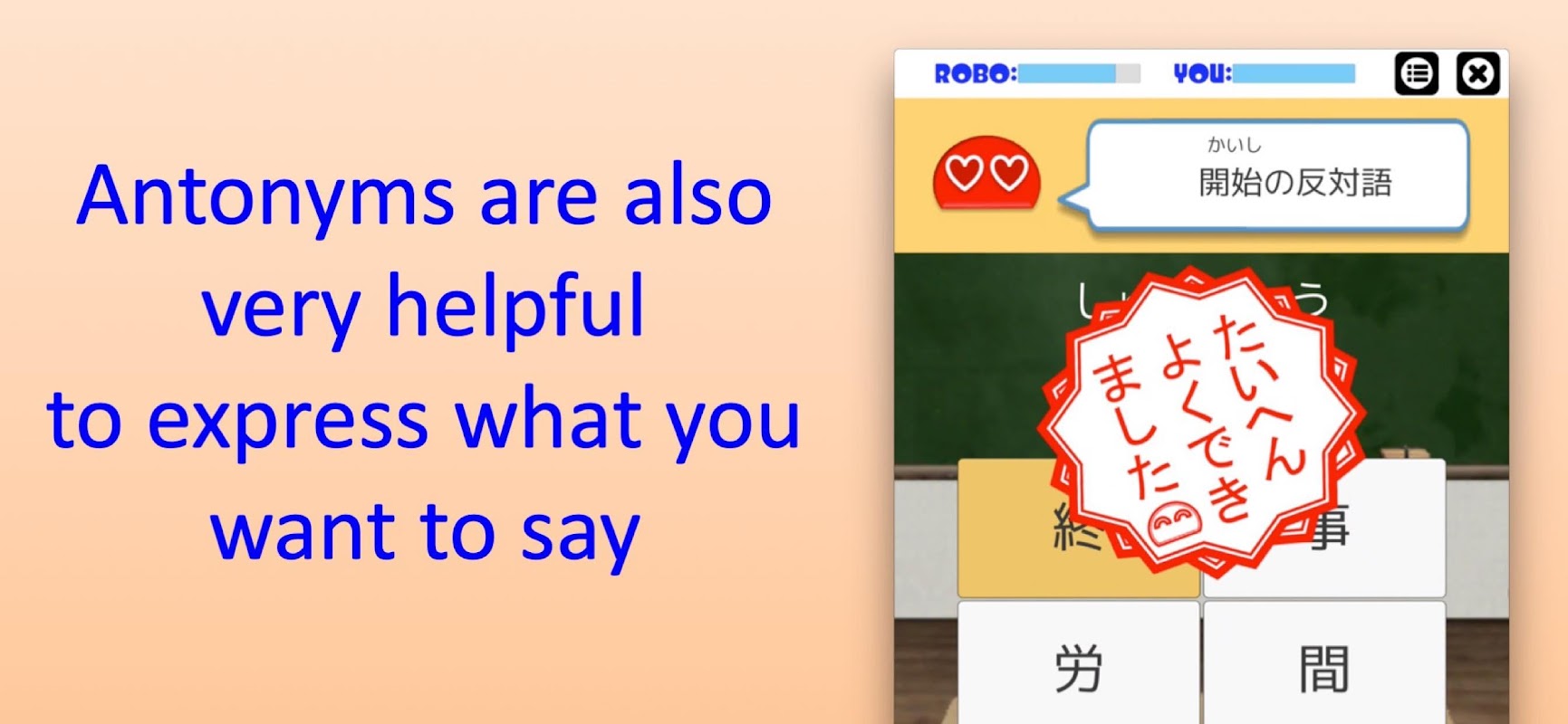idiom dua kanji, Niji-jyukugo, akan meningkatkan kosakata Jepang Anda untuk mengingat sinonim dan antonim.