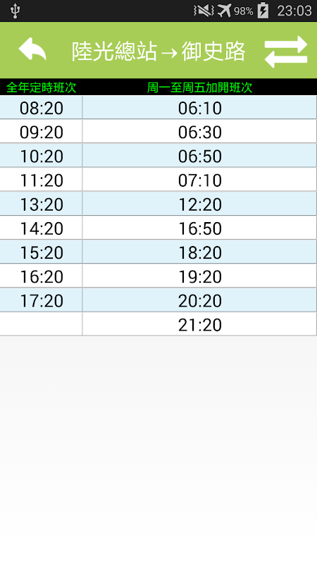 3.提供「陸光總站」往返「御史路站」免費接駁巴士時刻表。
