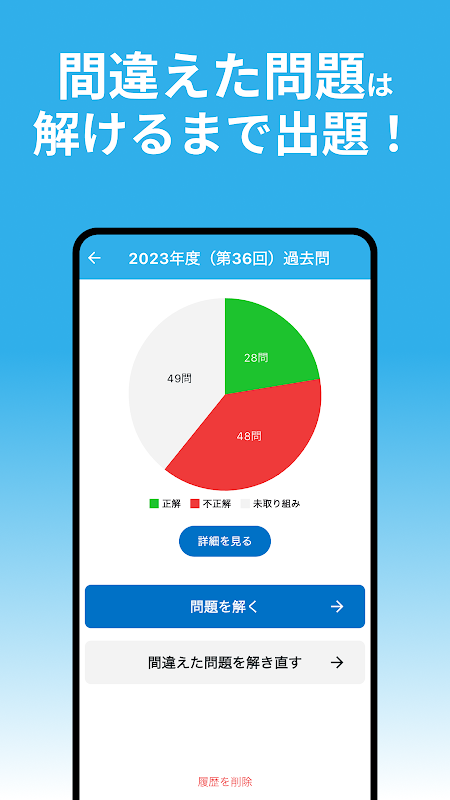 Hasil penyelesaian soal-soal sebelumnya tercermin dalam diagram lingkaran secara "real time" untuk setiap soal, sehingga Anda dapat dengan mudah melihat persentase jawaban benar, jawaban salah, dan soal belum terjawab! Terlebih lagi, Anda dapat memeriksa pertanyaan yang salah berdasarkan subjeknya, sehingga Anda dapat langsung memahami kelemahan Anda dan mengambil tindakan untuk meningkatkan efisiensi Anda!