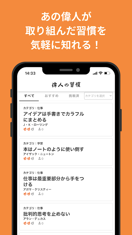 "Kebiasaan Orang Hebat" adalah aplikasi yang memudahkan Anda mengetahui kebiasaan yang dikerjakan oleh orang hebat itu dengan jumlah bea cukai terbesar di Jepang.