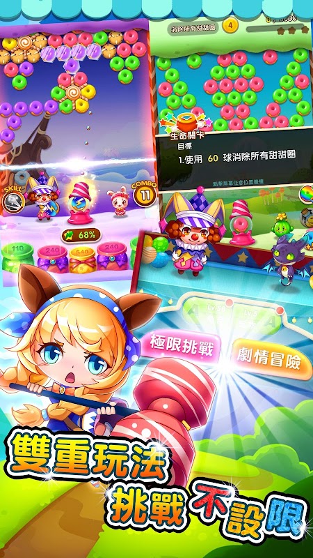 《全民泡泡大戰》是一款可愛度爆表的休閒類泡泡消除遊戲,玩家要把相同顏色的甜甜圈消除掉才可過關!超越經典玩法更多元,遊戲有300個以上關卡,更有超過10位可愛小夥伴及小寵物跟你一起冒險,每位夥伴均可有獨特的技能,讓你更易過關!