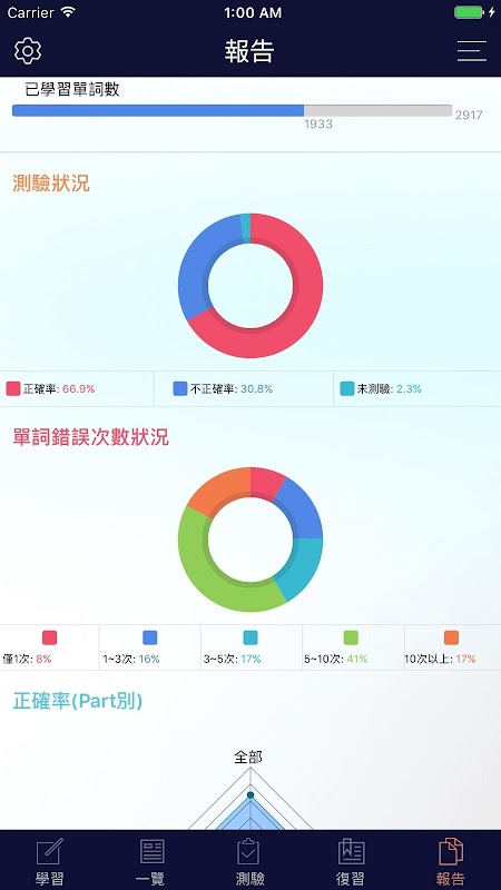 所有的學習和測驗過程都有記錄並用圖表展示,讓你對自己的學習進度一目瞭然!