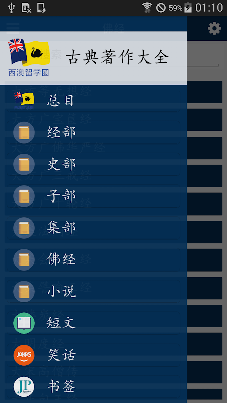 古典文学包含了经部-十三经,十三经注疏,史部-正史,地理,别杂史等,子部-诸子,道家,术数,兵家,兵家,科技,书法绘画,传习录-艺术,儒家,杂家,蒙学,释家,集部-总集,别集,戏曲,文论,小说-明清通俗小说,文言小说约500多部著作。此外还包括7000多篇短文,15000多则笑话。支持搜索,书签。明清小说列表: