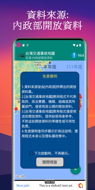 ● Aplikasi "Peta Kecelakaan Lalu Lintas Taiwan" bukan merupakan APP pemerintah dan tidak memiliki hubungan dengan pemerintah.