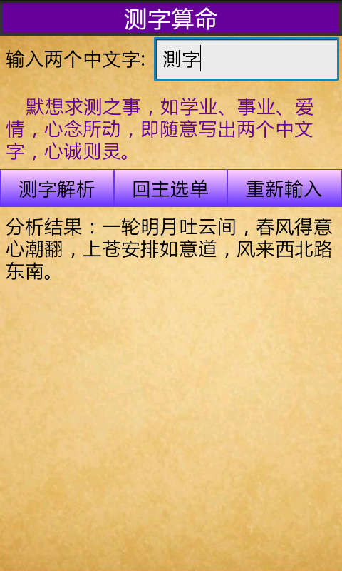 Program ini mencakup versi Tionghoa tradisional dan Tionghoa sederhana. Meramal adalah ilmu ramalan. Sistem ini menggunakan nama, tanggal lahir, dan ramalan kata untuk meramalkan nasib masa depan, sehingga orang dapat mencari keberuntungan dan menghindari nasib buruk.