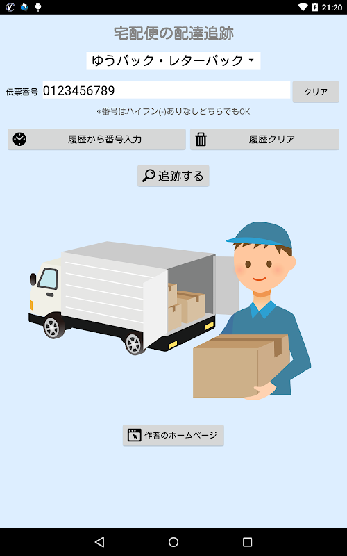 宅配便の伝票番号を入力すると、その宅配便が今どこにあるか追跡できます。 一度入力した番号は履歴に残るので、同じ番号を何度も検索するときも便利です。