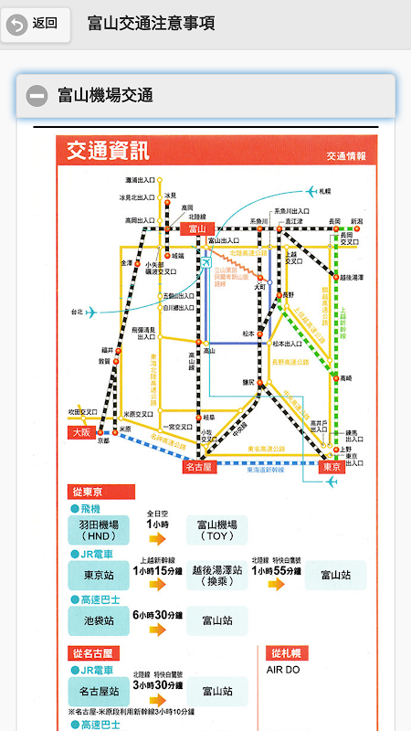 此APP的主要介紹富山旅遊、高岡市、立山黑部等,部分資訊來自於富山縣觀光課與金澤市觀光協會印製之書面資料,主要用途在推廣富山、金澤旅遊。