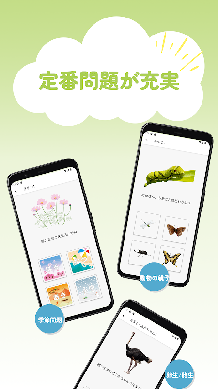 Ini adalah aplikasi edukasi yang bahkan anak-anak yang enggan mempelajari kertas persiapan ujian masuk sekolah dasar atau buku kerja persiapan masuk sekolah dasar dapat terus bersenang-senang dengan ilustrasi warna-warni dan karakter lucu yang akan menyemangati mereka.