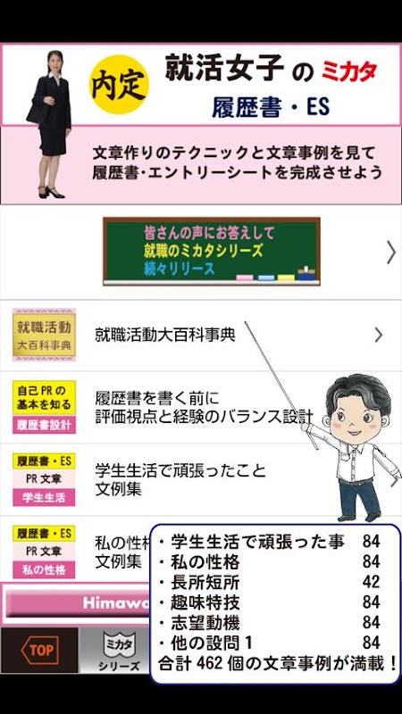 履歴書・エントリーシート(ES)の文例集アプリ 女子版です。