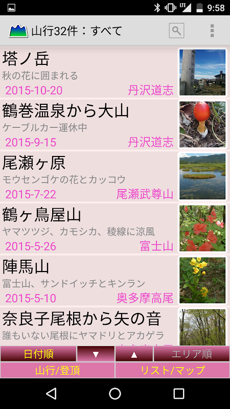 ▼山行の記録や登頂の記録の一覧をリストや地図上に写真付きで表示します。