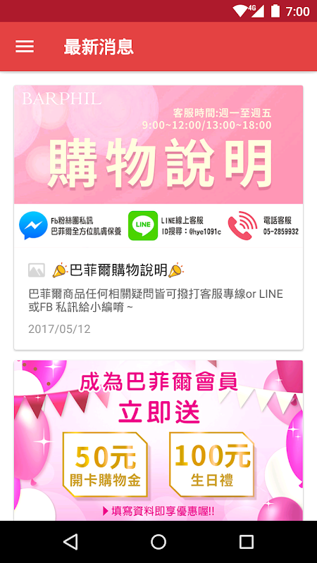 巴菲爾全方位肌膚保養,全新行動專屬購物平台,24H購物不打烊!讓您掌握巴菲爾最新商品資訊,及優惠活動;商品快速搜尋、超商便利取貨、一卡付費等服務、提供您快捷的購物新體驗,更可透過「留言給店家」、服務」,將您的建議第一時間告知我們,以利我們給予您最周全的服務!