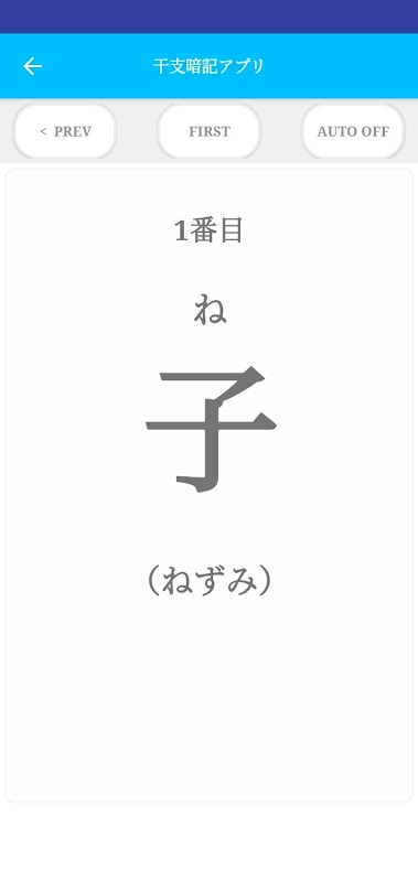 Dalam mode daftar, kanji dan bacaan dari dua belas tanda zodiak (et) yang akan dihafal ditampilkan.