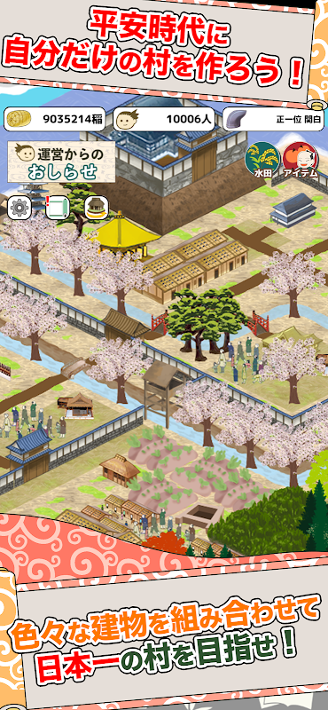 Ini adalah permainan sejarah di mana siapa pun, apakah Anda tertarik dengan nama keluarga atau tidak, dapat mengembangkan desa yang diberi nama sesuai nama keluarga Anda dan menyatukan Jepang. Dalam pemeringkatan tersebut, Anda dapat bersaing dengan desa-desa terkuat di Jepang dan seluruh dunia untuk melihat perkembangannya. Saat ini, jumlah keluarga semakin sedikit, jadi mari rasakan serunya memanen padi, memperluas keluarga, dan mengembangkan desa Anda. Ini adalah ``Aplikasi Simulasi Pelatihan Desa Panen Padi'' berlatar zaman Heian, yang lahir dari game hit ``Ayo Membuat Desa Sengoku''.