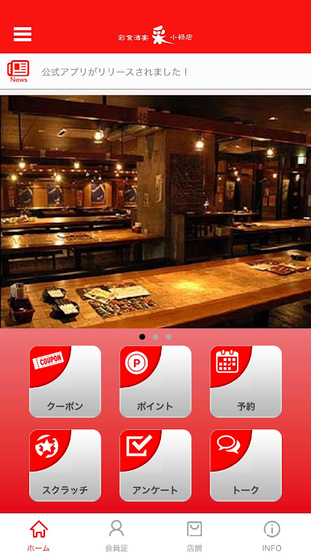 店舗で使えるポイントカード機能/アプリ会員証やクーポンでアプリ会員限定の特典をゲット/店舗の最新情報をプッシュ通知でお届け/現在地からの行き方をナビでご案内/facebookなどのSNSリンク