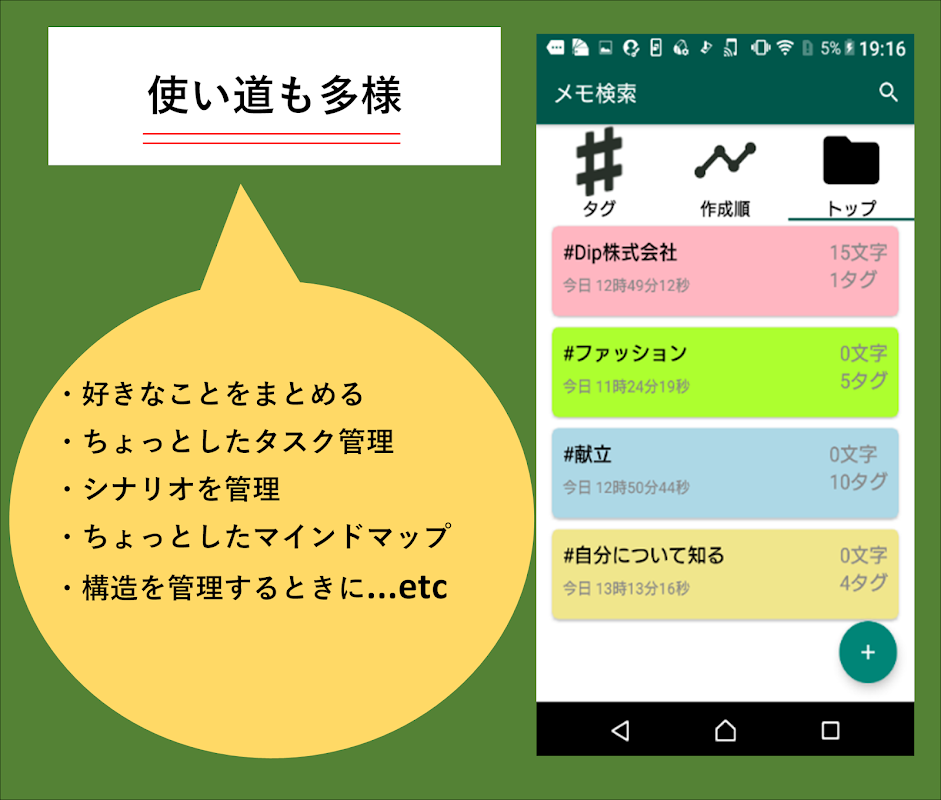Aplikasi ini adalah aplikasi yang memungkinkan Anda untuk merekam (mengingat) dan mengelola tagar agar Anda tidak lupa dengan memo yang Anda masukkan. (Peta sinapsis)