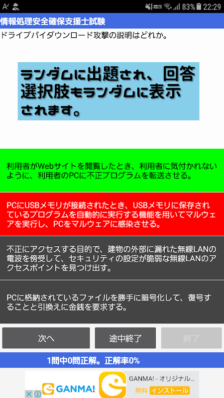 ・ランダムに出題され、回答選択肢もランダムに表示されます。