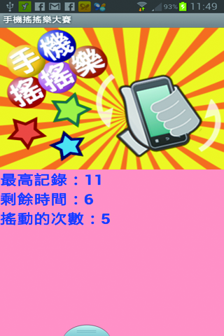 按下 開始倒始計時 鈕,就會開始倒數計時,此時小鼓聲響起,當倒數時間終了,鈴聲大作,選手就可開始用力地搖動手機,每搖動一次手機就會聽到 「?、? 」的聲音。當比賽時間終了,鈴聲也會大作,畫面上會顯示您搖動次數