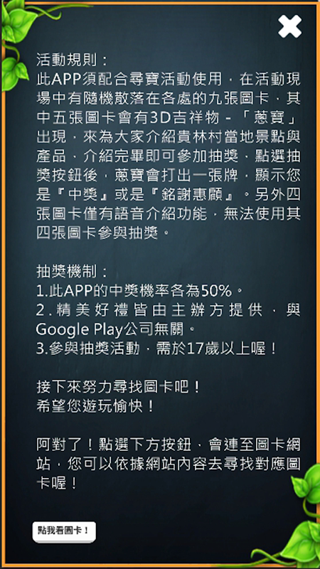 此APP需配合尋寶活動使用。在活動當日使用者須下載APP,並在活動現場尋找散落的九張圖卡,其中五張圖卡會有3D吉祥物-「蔥寶」出現,來介紹貴林村當地的景點與產品,介紹完畢即可抽獎,按下抽獎鈕即會顯示中獎與否,精美獎項由活動主辦方提供。另外四張圖卡僅有語音介紹功能,無法使用其四張圖卡參與抽獎。