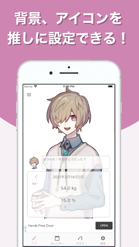 Anda tidak hanya dapat mengatur rekomendasi favorit Anda sebagai latar belakang dan ikon, tetapi Anda juga dapat mencatat berat badan Anda dengan sangat mudah karena memiliki layar input yang sederhana, kalender jenis daftar yang mudah dibaca, dan fungsi grafik yang memungkinkan Anda untuk melakukannya secara intuitif. memahami transisi berat badan, lemak tubuh, dan BMI. Saya akan!