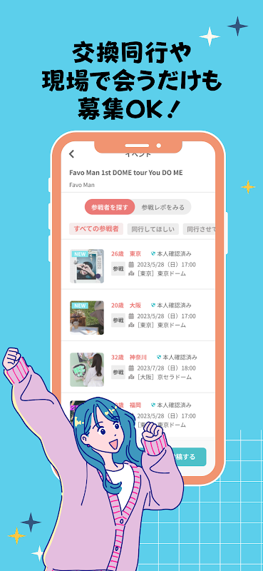 Ini adalah aplikasi otaku khusus wanita yang memungkinkan Anda menemani orang-orang ke konser, bertukar barang, dan menikmati tiket, perjalanan, dan kafe secara berurutan.