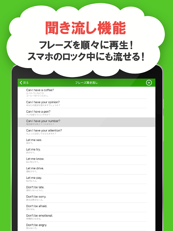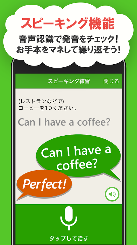 Selain itu, aplikasi ini juga dilengkapi fungsi ``Phrase Listen'' yang memungkinkan Anda memutar suara asli bahasa Inggris sekaligus, dan fungsi ``Speaking Practice'' yang secara otomatis menilai suara bahasa Inggris Anda sendiri.