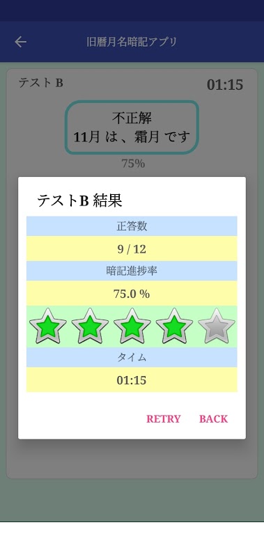 Dalam mode daftar, kanji dan pembacaan nama bulan gaya Jepang yang akan dihafal ditampilkan.