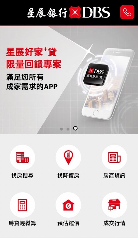 業界首發 App,一口氣為您結合房市訊息、找房搜尋及成交行情,有合適的房屋即可進行房貸月付金試算、家庭收支分析及銀行預估鑑價諮詢,讓您從開始選擇房屋物件到完成銀行房貸的每個階段,都能自在優雅,不再焦頭爛額。星展好家貸App,All in one的功能,輕鬆助您成就對家的夢想