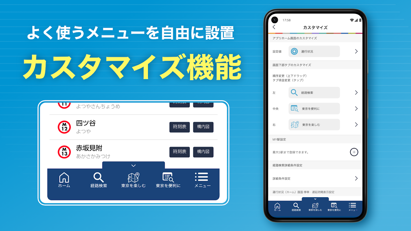 Ini adalah aplikasi gratis resmi Tokyo Metro. Aplikasi ini menampilkan informasi operasional dan posisi kereta untuk jalur Tokyo Metro dan Toei Subway, informasi kemacetan secara real-time untuk setiap gerbong, dan memungkinkan pencarian rute yang menggabungkan berbagai moda transportasi seperti kereta api, taksi, sepeda bersama, dan bus komunitas.