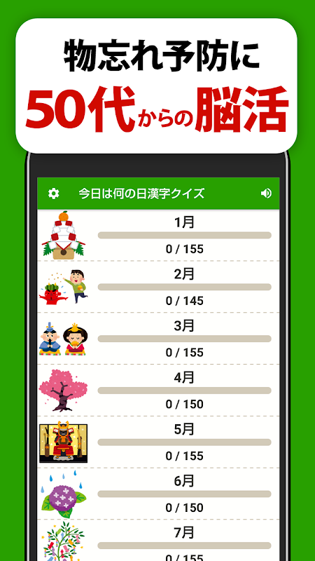 Ada 5 kuis kanji setiap hari terkait dengan hari itu. Pelatihan otak setiap hari dengan kuis kanji tulisan tangan yang sempurna untuk manula!